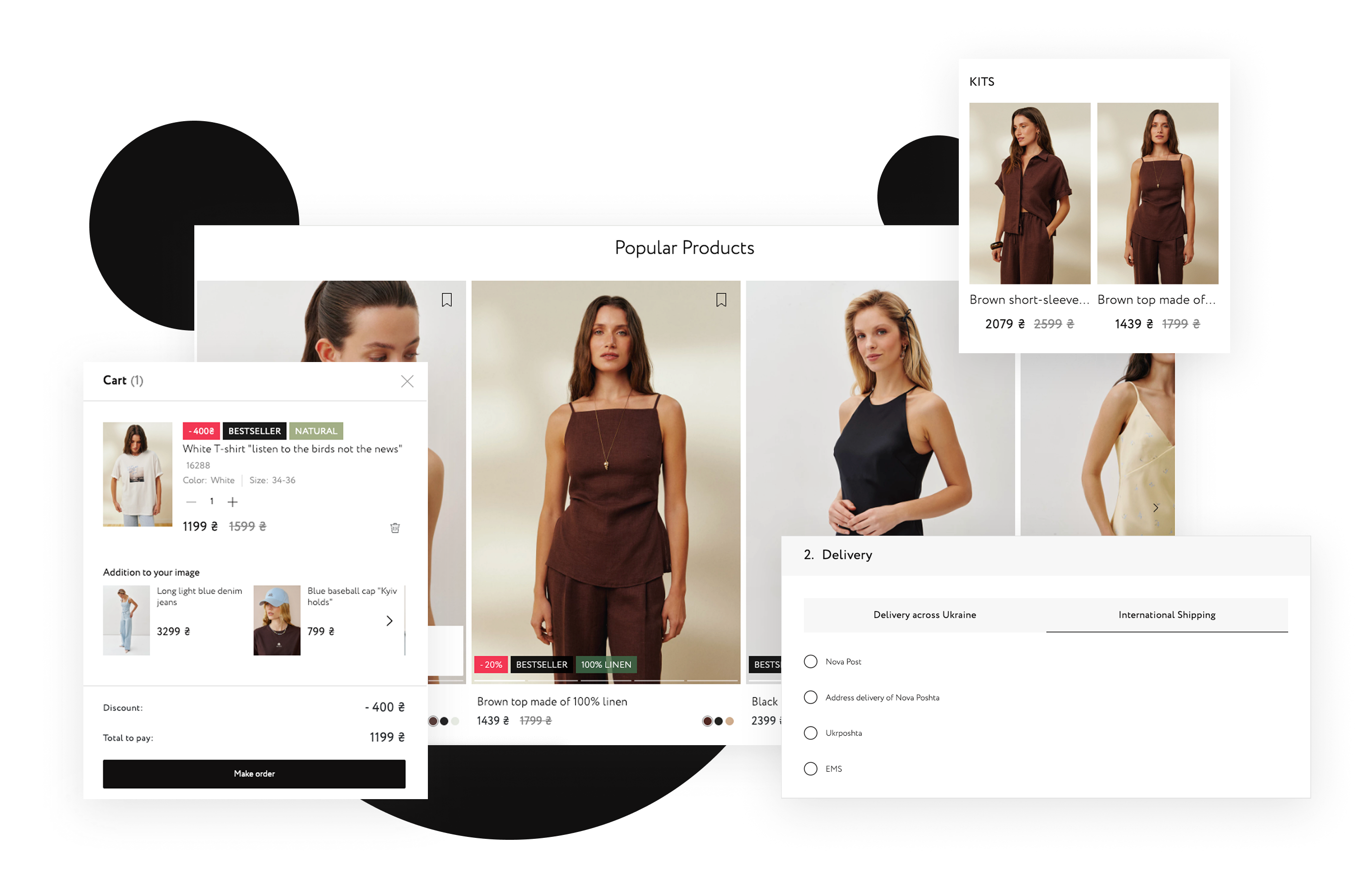 Синхронизация с наружными сервисами. Реализована интеграция с 1С, eSputnik, Tranzo, Google Merchant и Shopify для автоматизации обмена данными, управления товарами и синхронизации заказов.