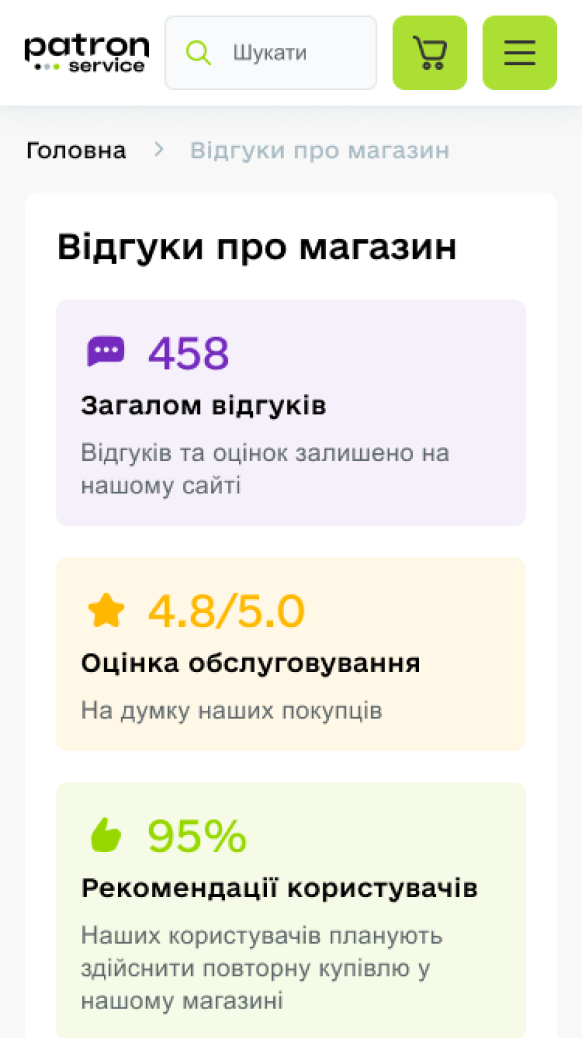 Відгуки про товар з відповіддю адміністратора: Забезпечує обмін враженнями користувачів та взаємодію з адміністратором.