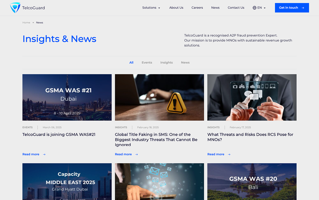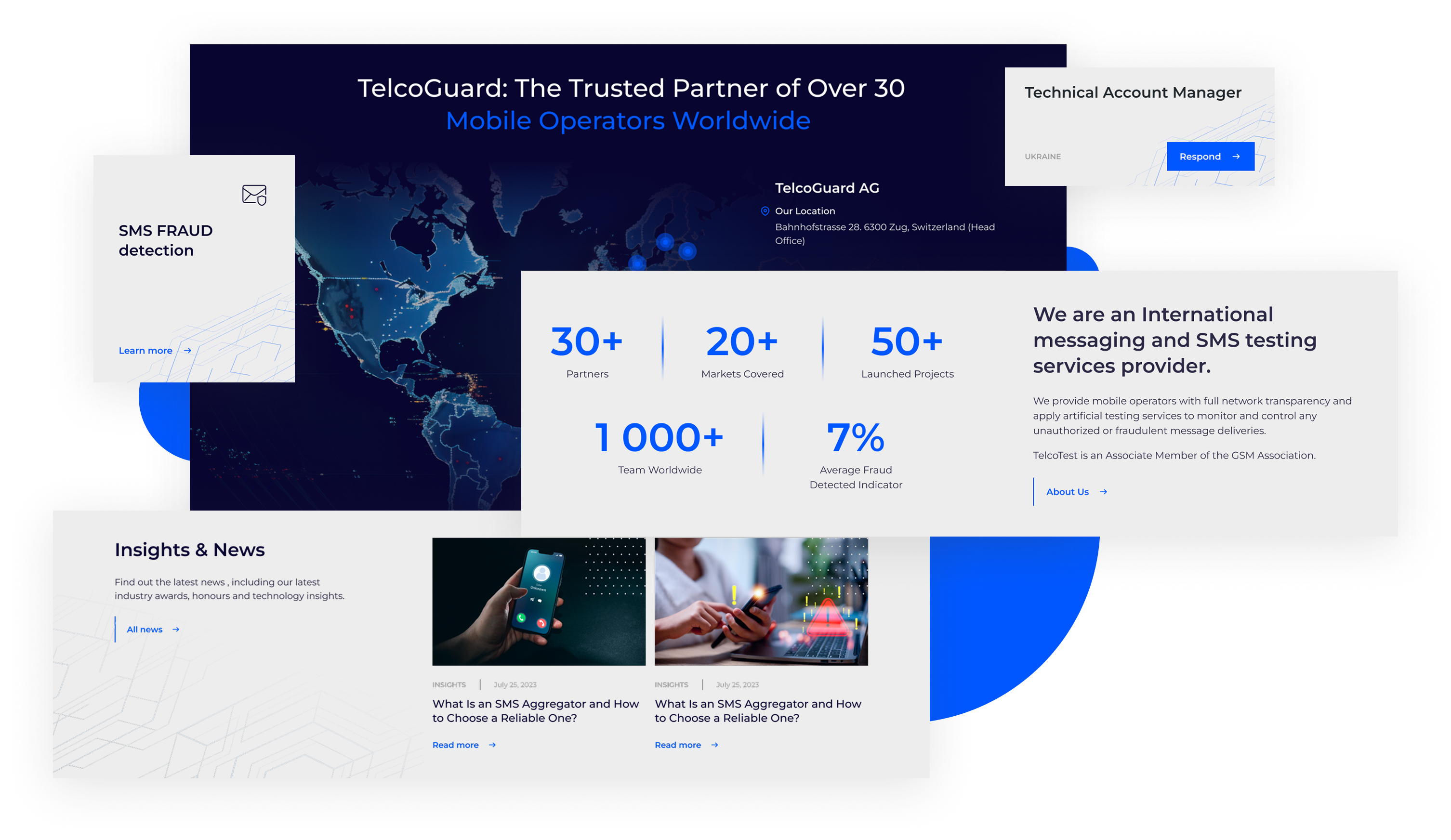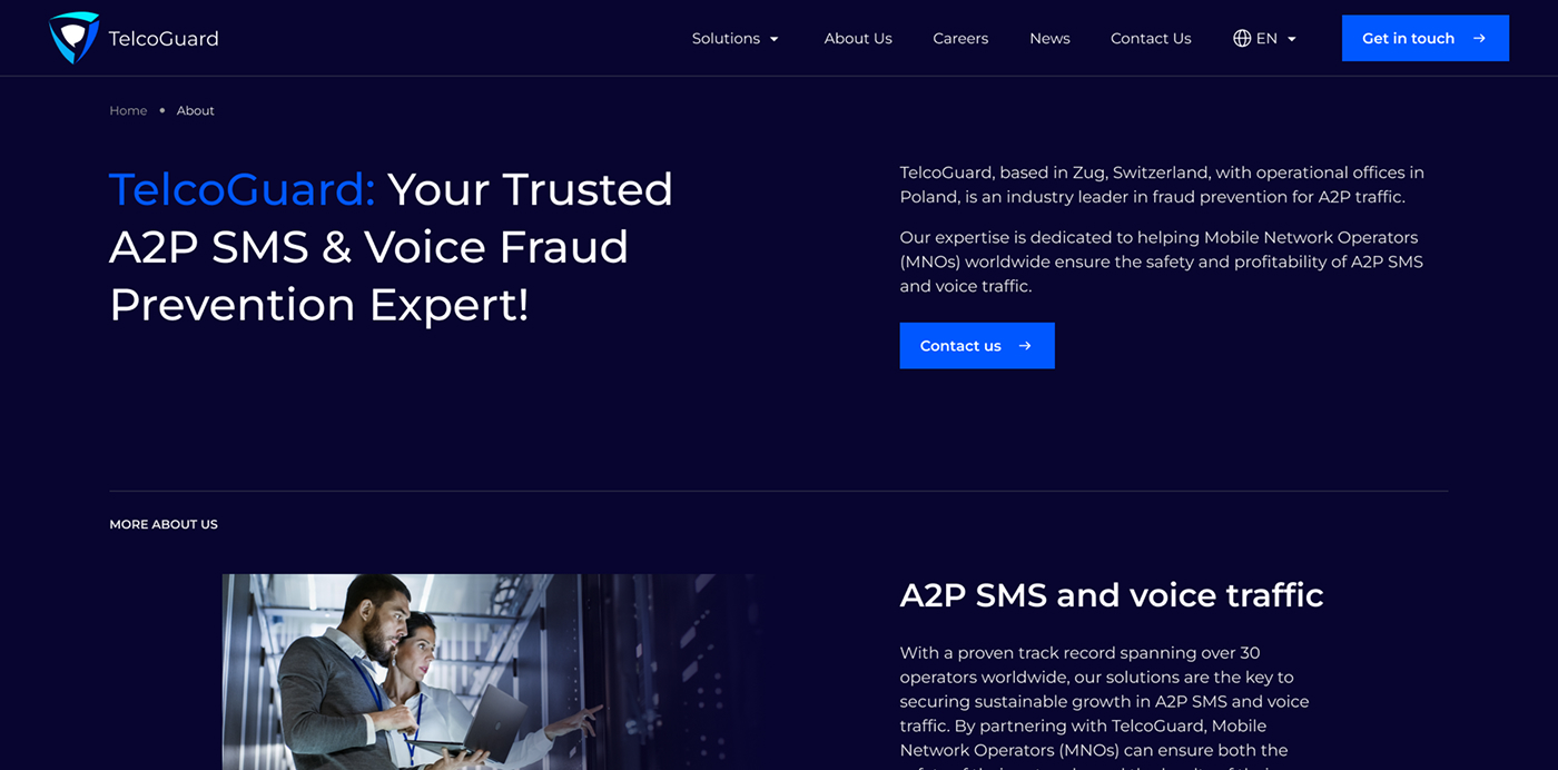 Telco Guard — це компанія, що спеціалізується на антифрод-рішеннях, захисті телекомунікаційних мереж, гарантії доходів і кібербезпеці. Платформа презентує послуги з обміну повідомленнями, захисту від шахрайства та аналітики для операторів зв’язку. Сайт є ключовим інструментом для залучення клієнтів, демонстрації експертизи та зміцнення іміджу компанії як надійного партнера в галузі кібербезпеки.
