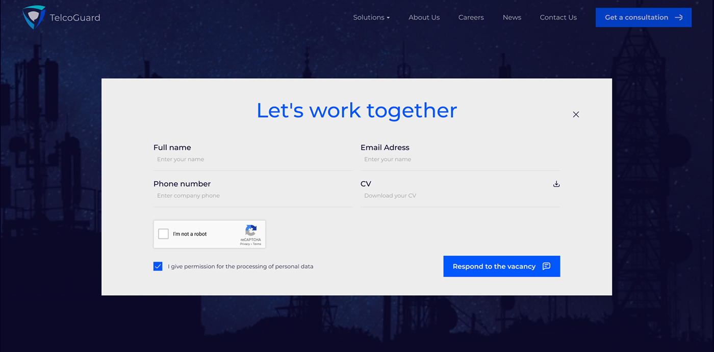 Необхідно було розробити логічну структуру сайту та концепцію дизайну. Мета — забезпечити інтуїтивну навігацію та візуальний стиль, який підкреслює надійність і технологічність Telco Guard.