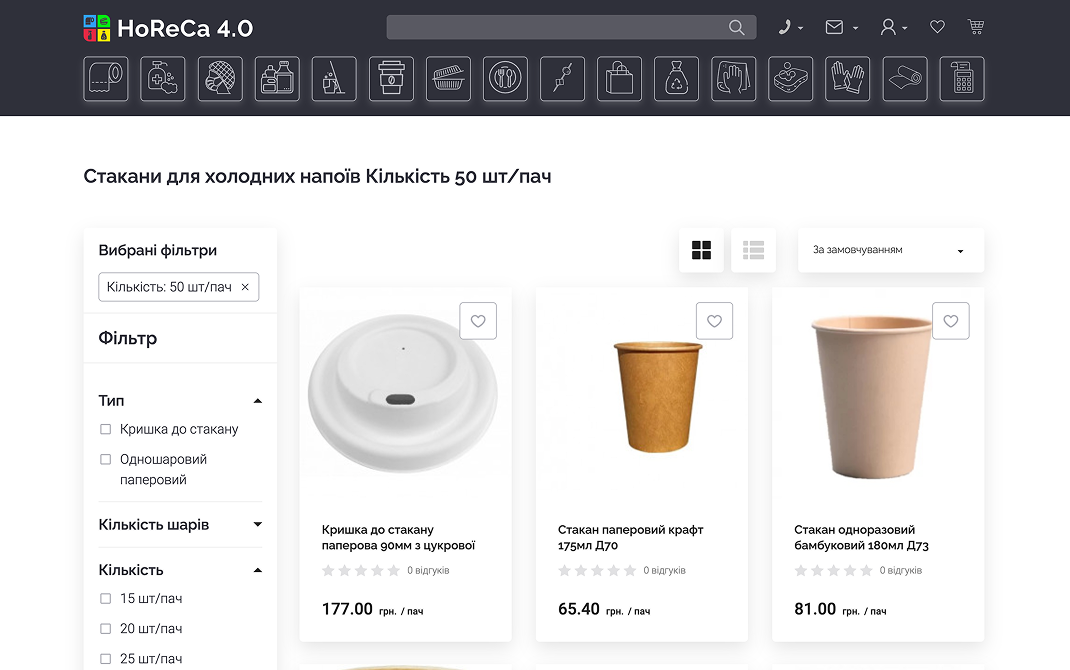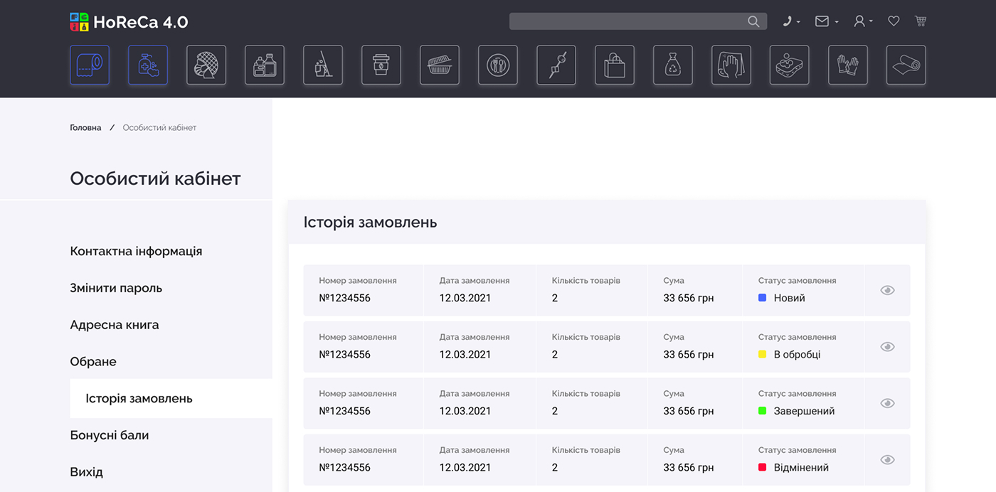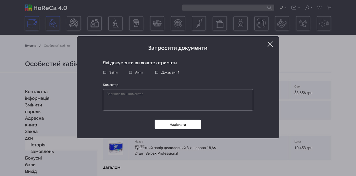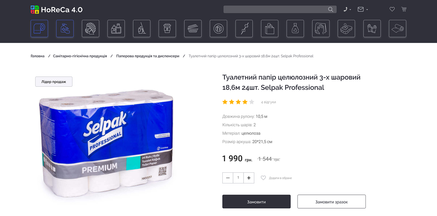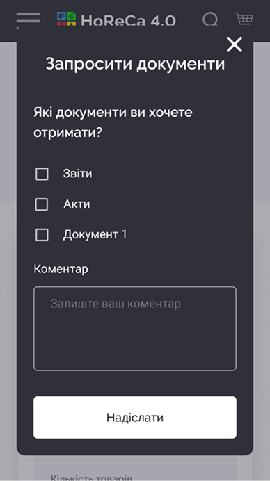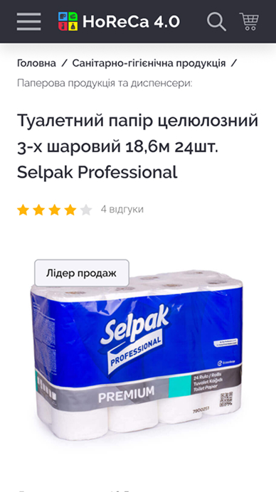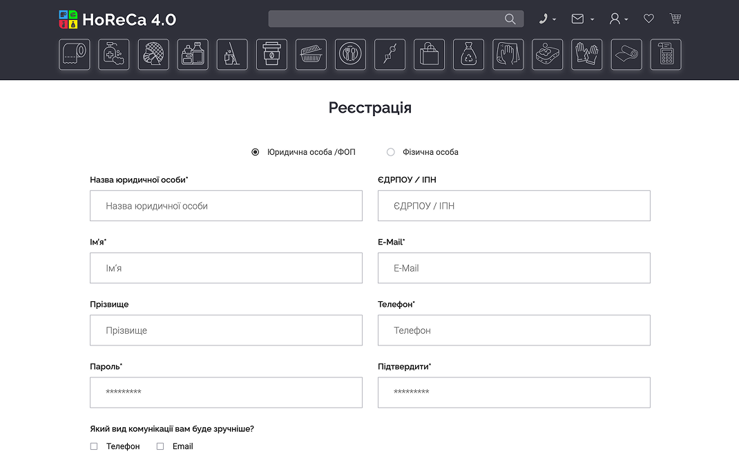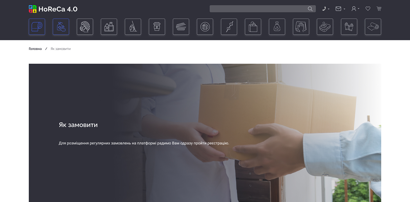 HoReCa 4.0 — платформа для продажу непродовольчої продукції, орієнтована на заклади харчування та ресторани. Сервіс дозволяє клієнтам швидко оформлювати замовлення онлайн, а власникам бізнесу — ефективно керувати процесом замовлень та взаємодією з постачальником.