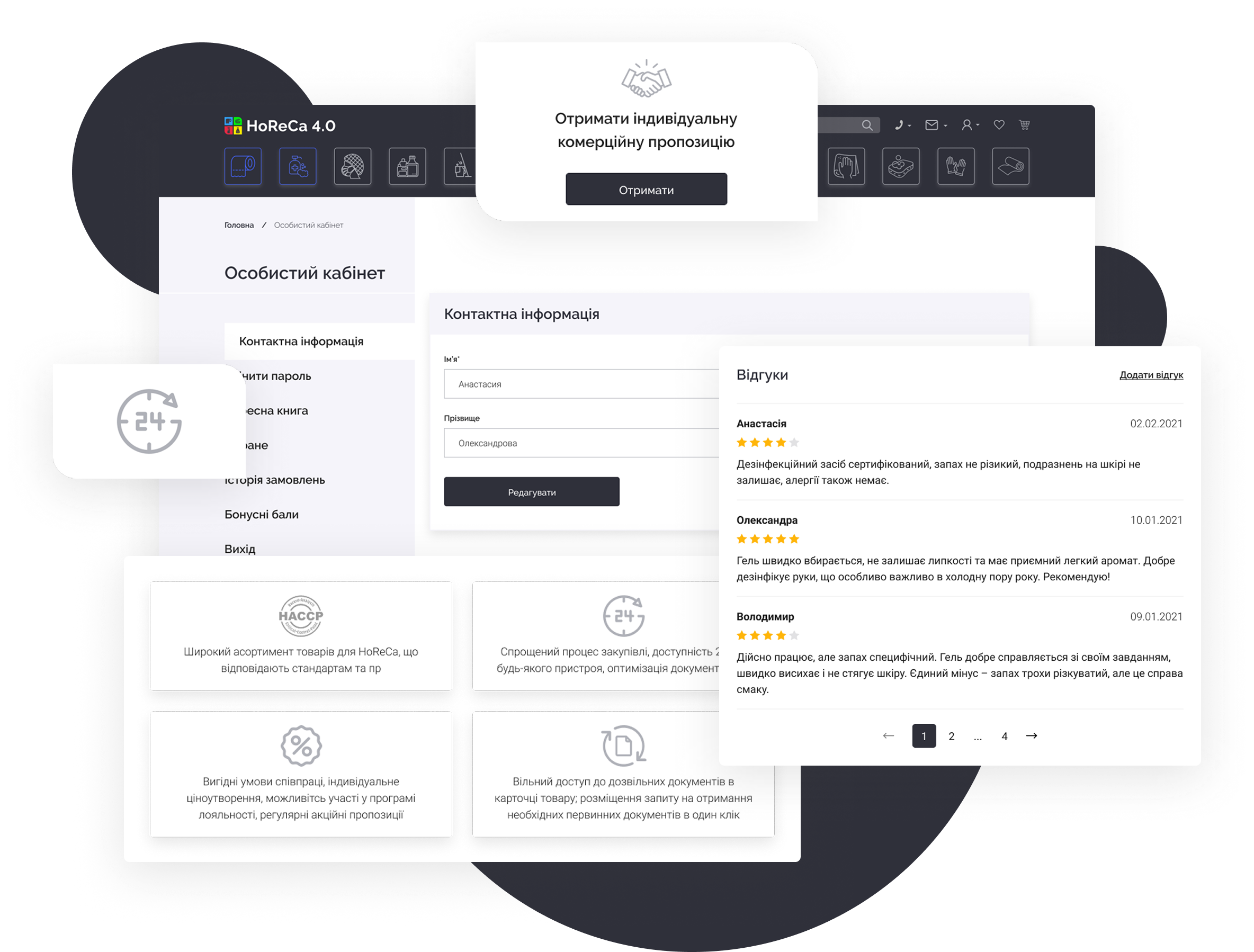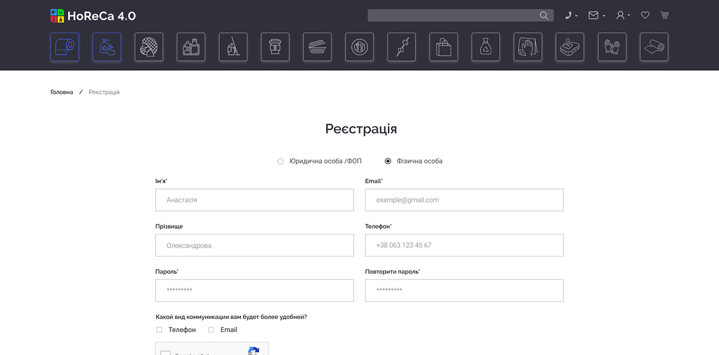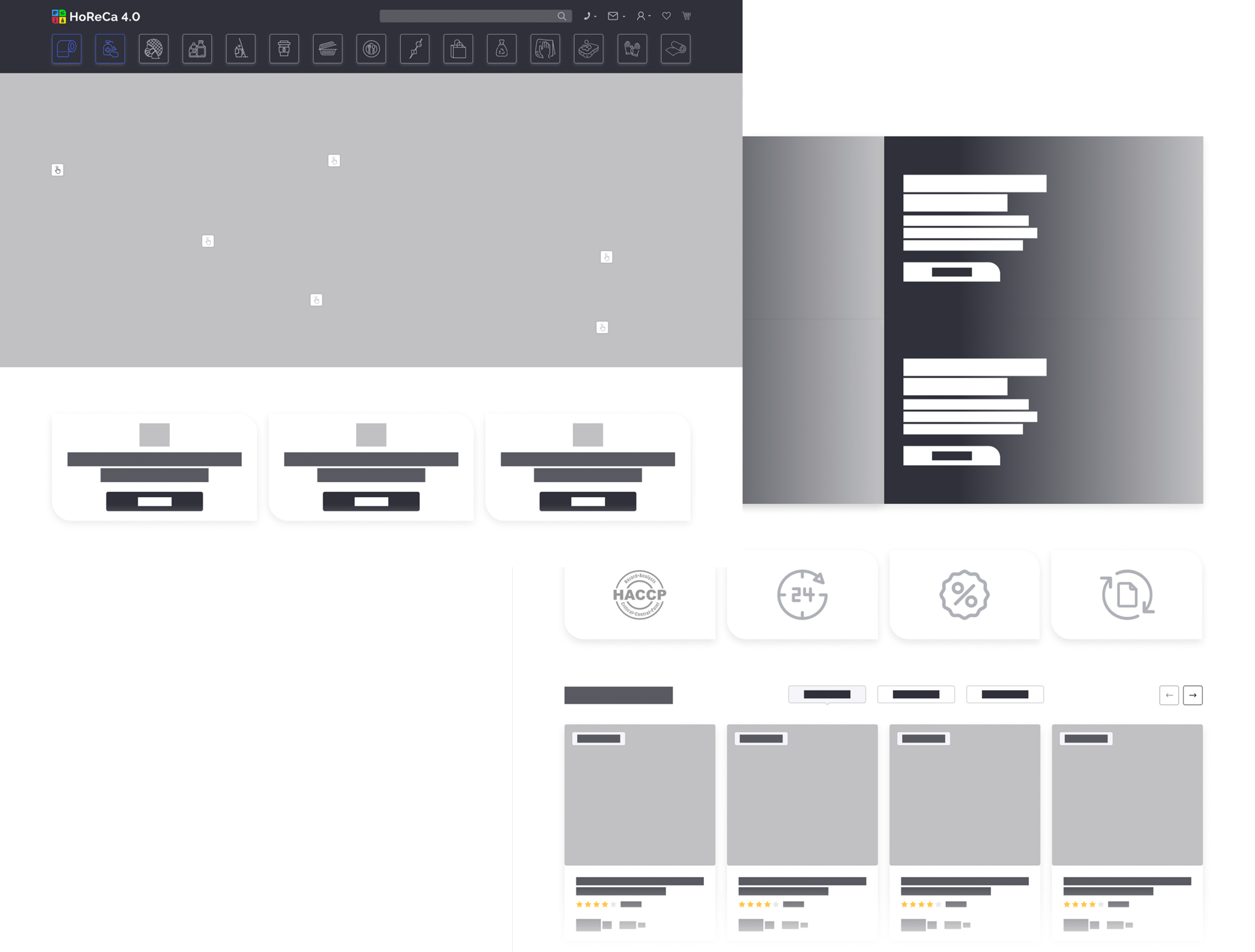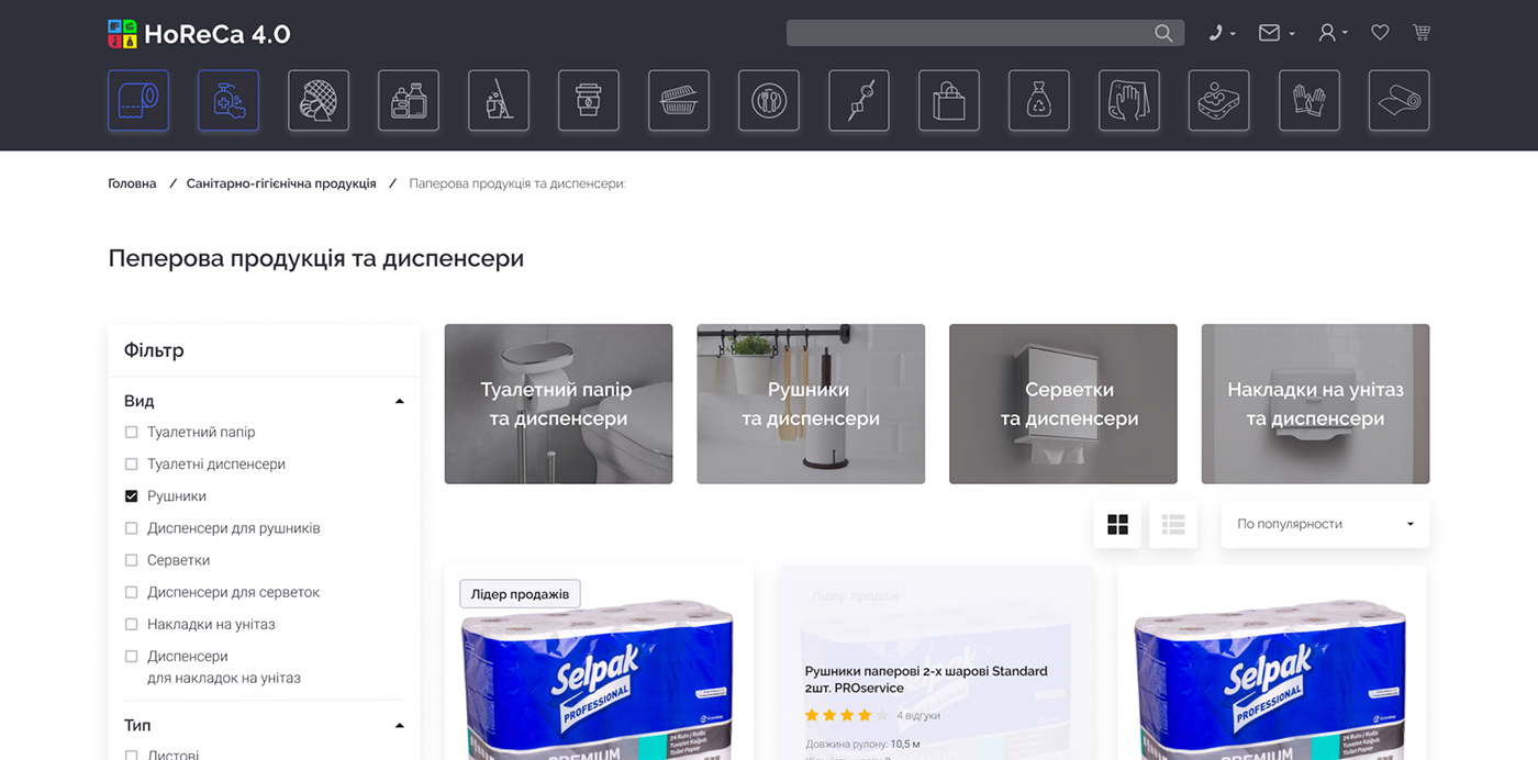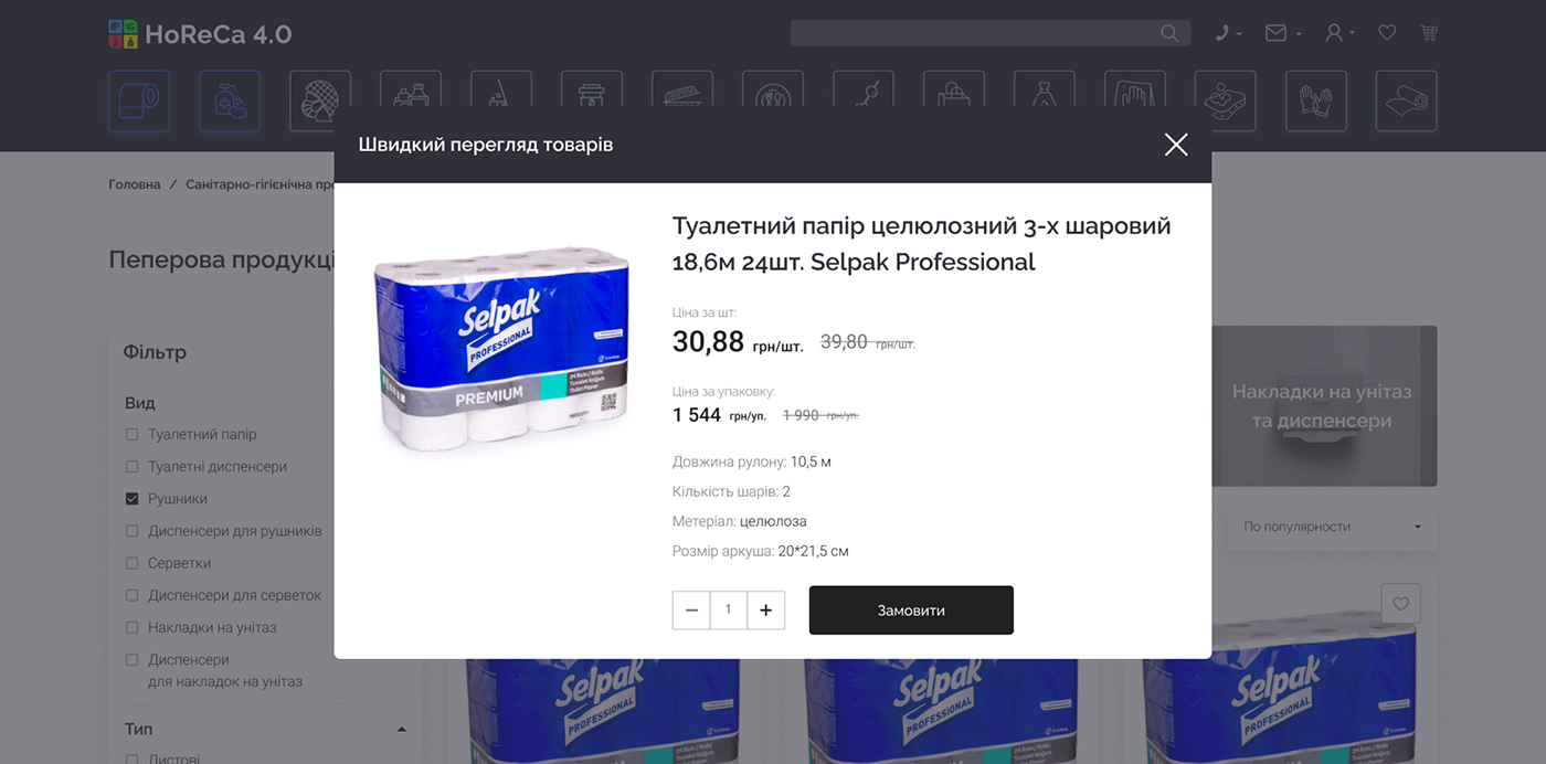 HoReCa 4.0 — платформа для продажу непродовольчої продукції, орієнтована на заклади харчування та ресторани. Сервіс дозволяє клієнтам швидко оформлювати замовлення онлайн, а власникам бізнесу — ефективно керувати процесом замовлень та взаємодією з постачальником.