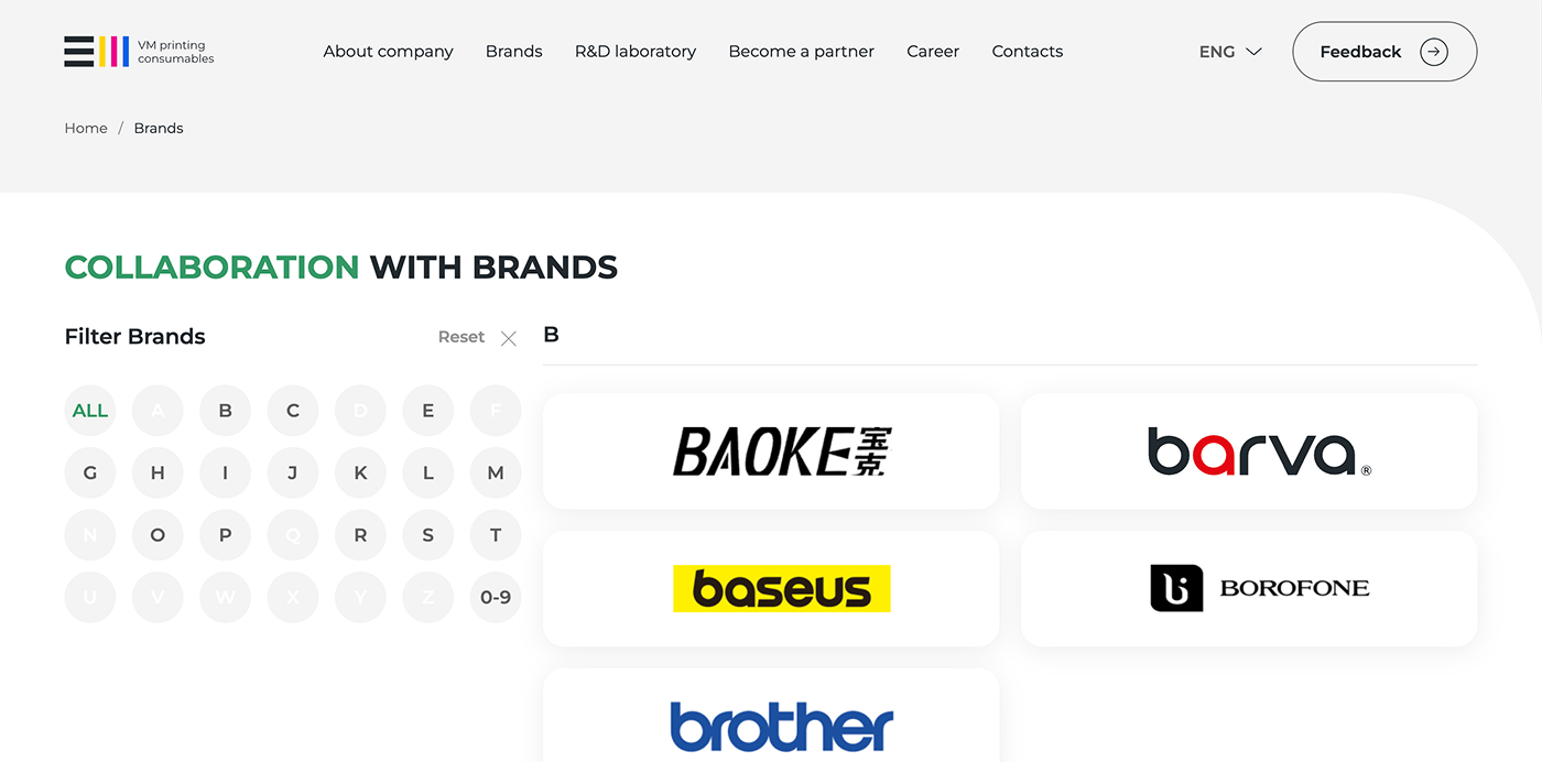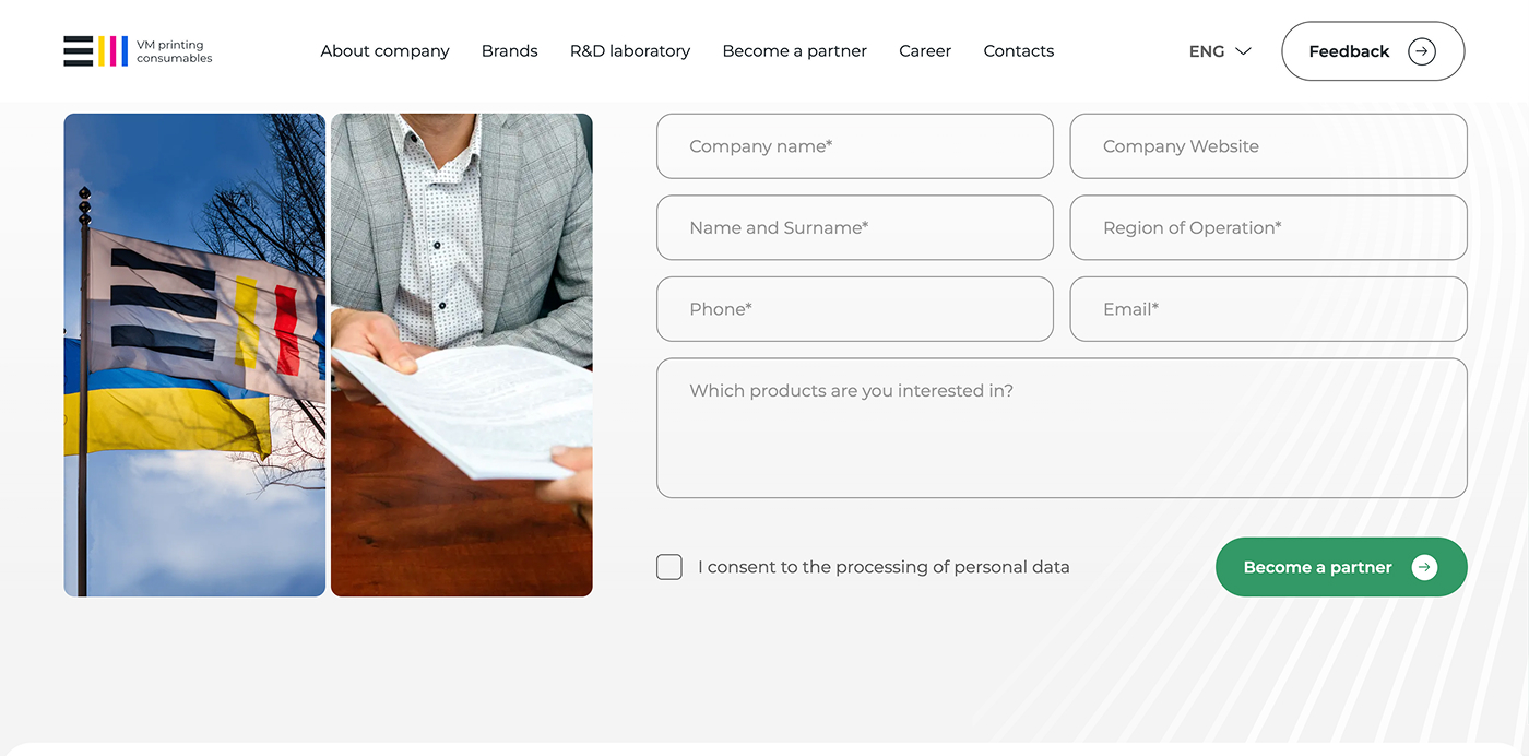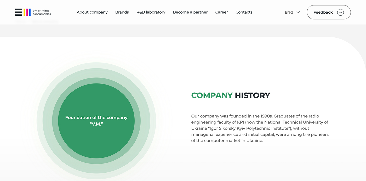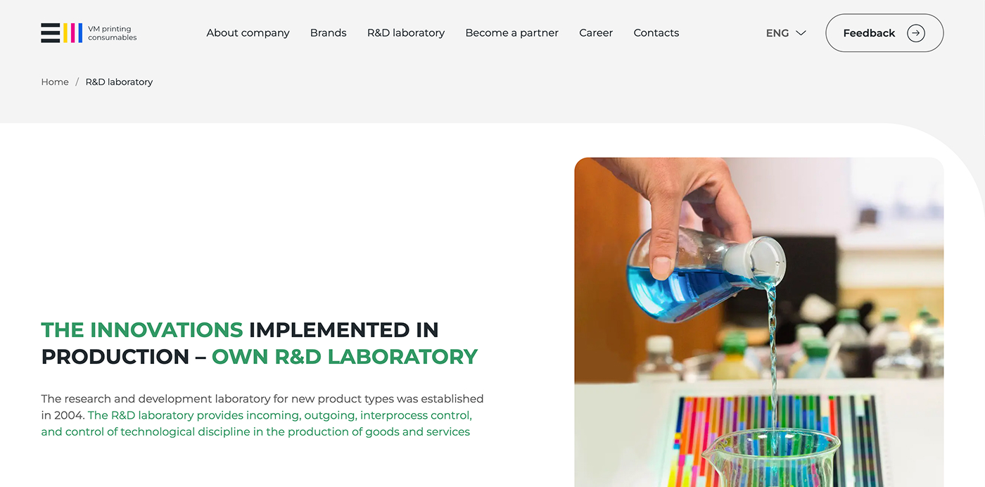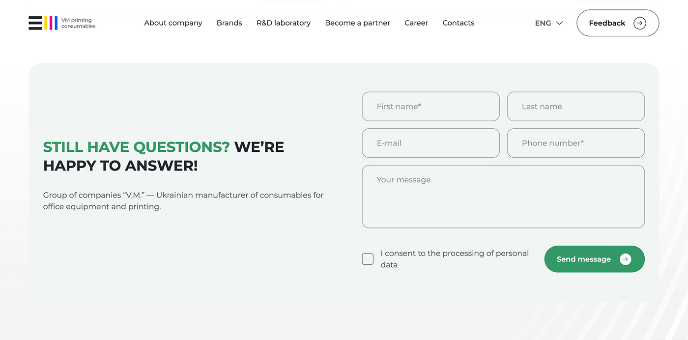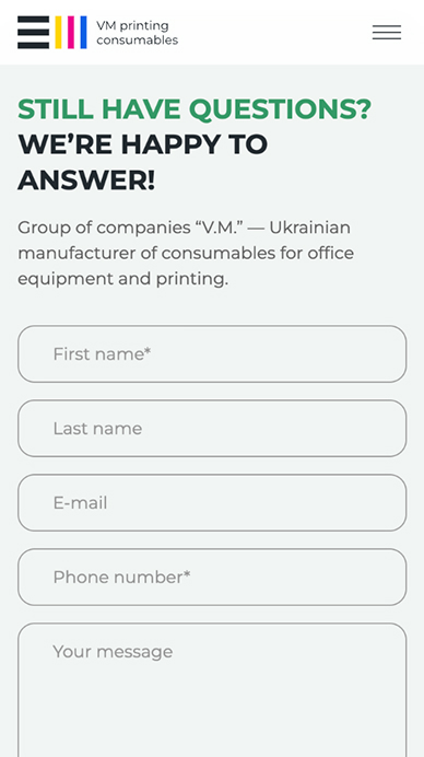 Корпоративний сайт української компанії, яка спеціалізується на виробництві та постачанні витратних матеріалів для офісної техніки та друку. Компанія пропонує широкий асортимент продукції, включаючи чорнила, тонери, картриджі, засоби для чищення та інші товари для сучасного офісу. Значна частина продукції розробляється у власній дослідницькій лабораторії та виготовляється на виробничих потужностях під Києвом.